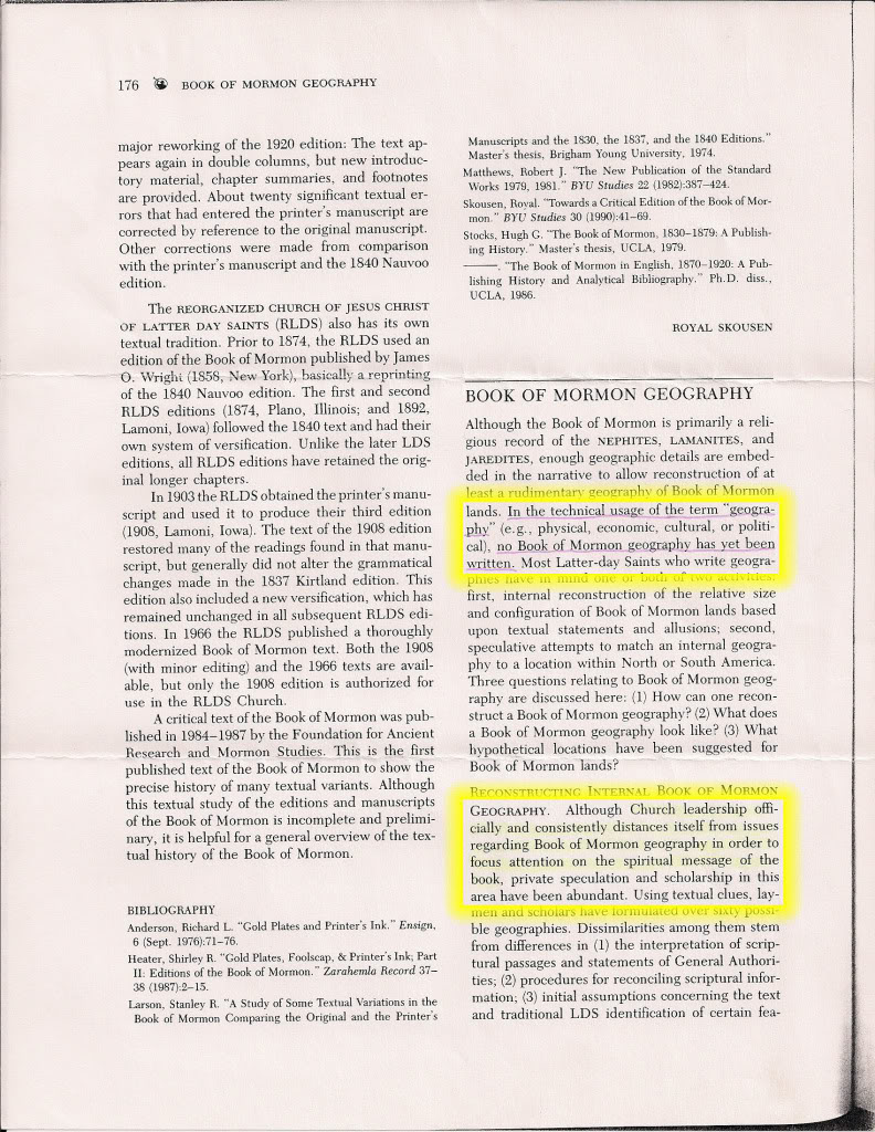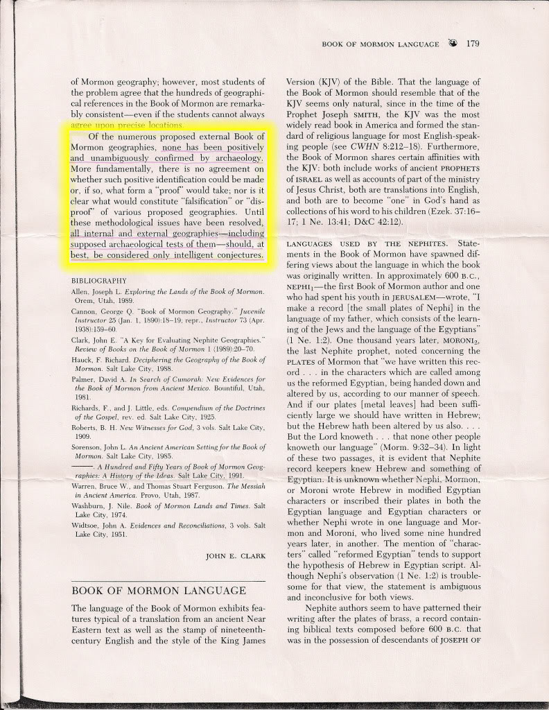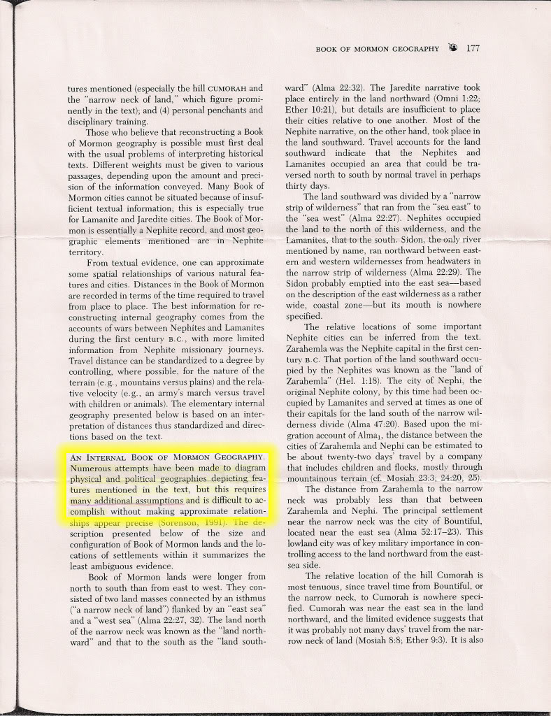 Enclosed with the letter were copies of pages from the Encyclopedia of Mormonism. These particular pages were laced with words like “assumptions,” “speculations,” “attempts have been made,” “locations unknown,” “conjectures,” “not yet revealed,” etc.