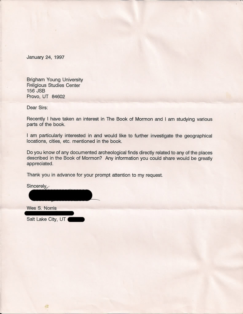 In 1997, six years after my first letter to BYU, I sent another letter to the BYU Religious Studies Center asking about Book of Mormon geography and if there is any known corroborating archaeological support.