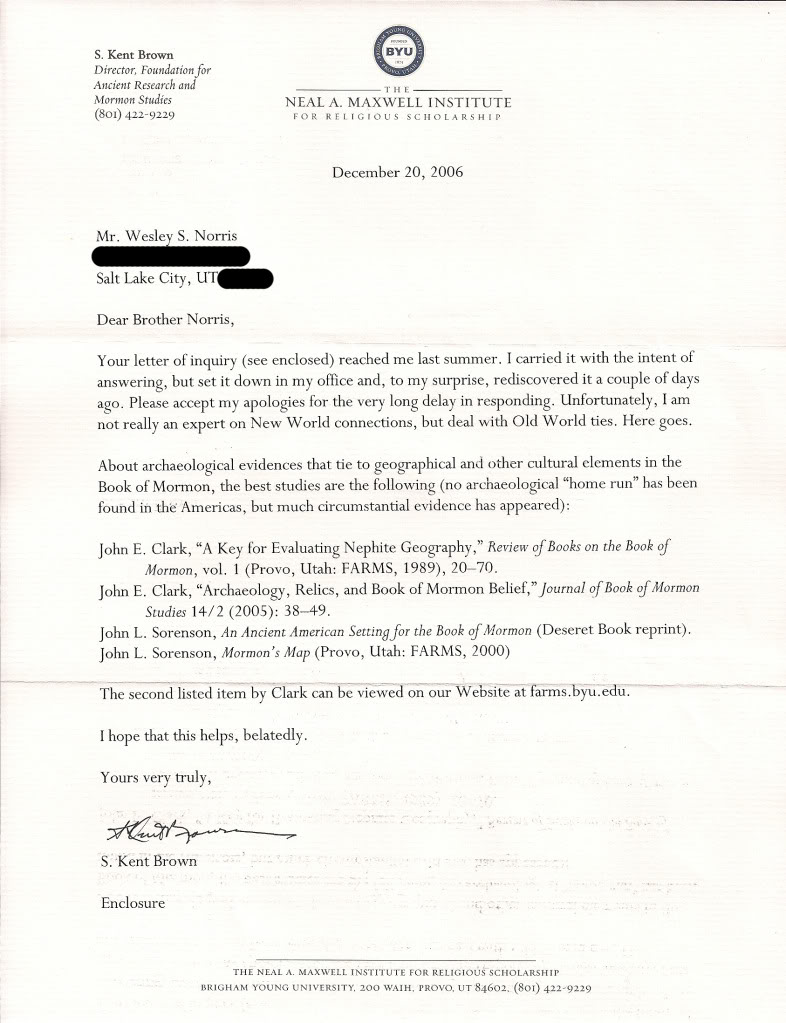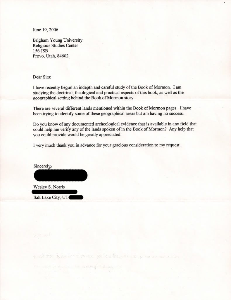 In 2006, nearly 10 years after my second letter to BYU, I sent yet another inquiry to BYU asking for any kind of evidence in any known field of study that would verify the lands spoken of in the BoM. This time I sent the letter to the Neal A. Maxwell Institute for Religious Scholarship at BYU.