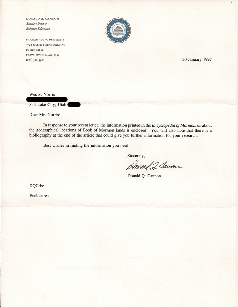 The reply that I received from Donald Q. Cannon, Associate Dean of Religious Education at BYU, was a bit different from the one I had received six years earlier, nonetheless, the answers were from LDS sources and were essentially the same as the previous letter. And once again, this official correspondence from BYU religious personnel confirmed to me that there are no geographical or archaeological facts known about any of the cities, people groups or the stories found within the pages of the BoM.