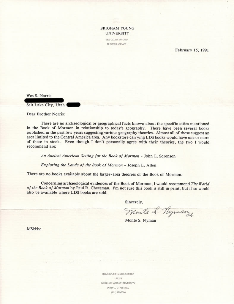 Within a few days, I received a reply from Professor Monte S. Nyman of the BYU Religious Studies Center. Here is that letter: