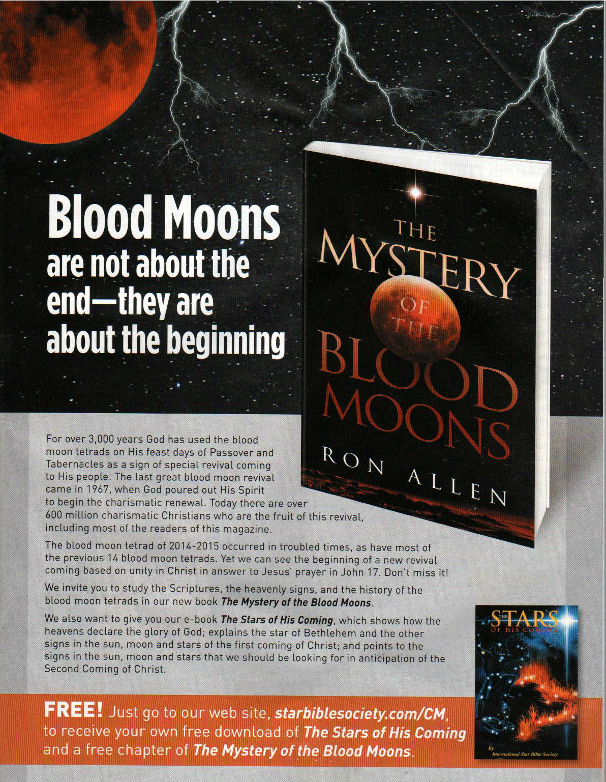 we invite you to study the Scriptures, the heavenly signs, and the history of the blood moon tetrads in our new book . . . ” (Charisma, December 2015, p.9)