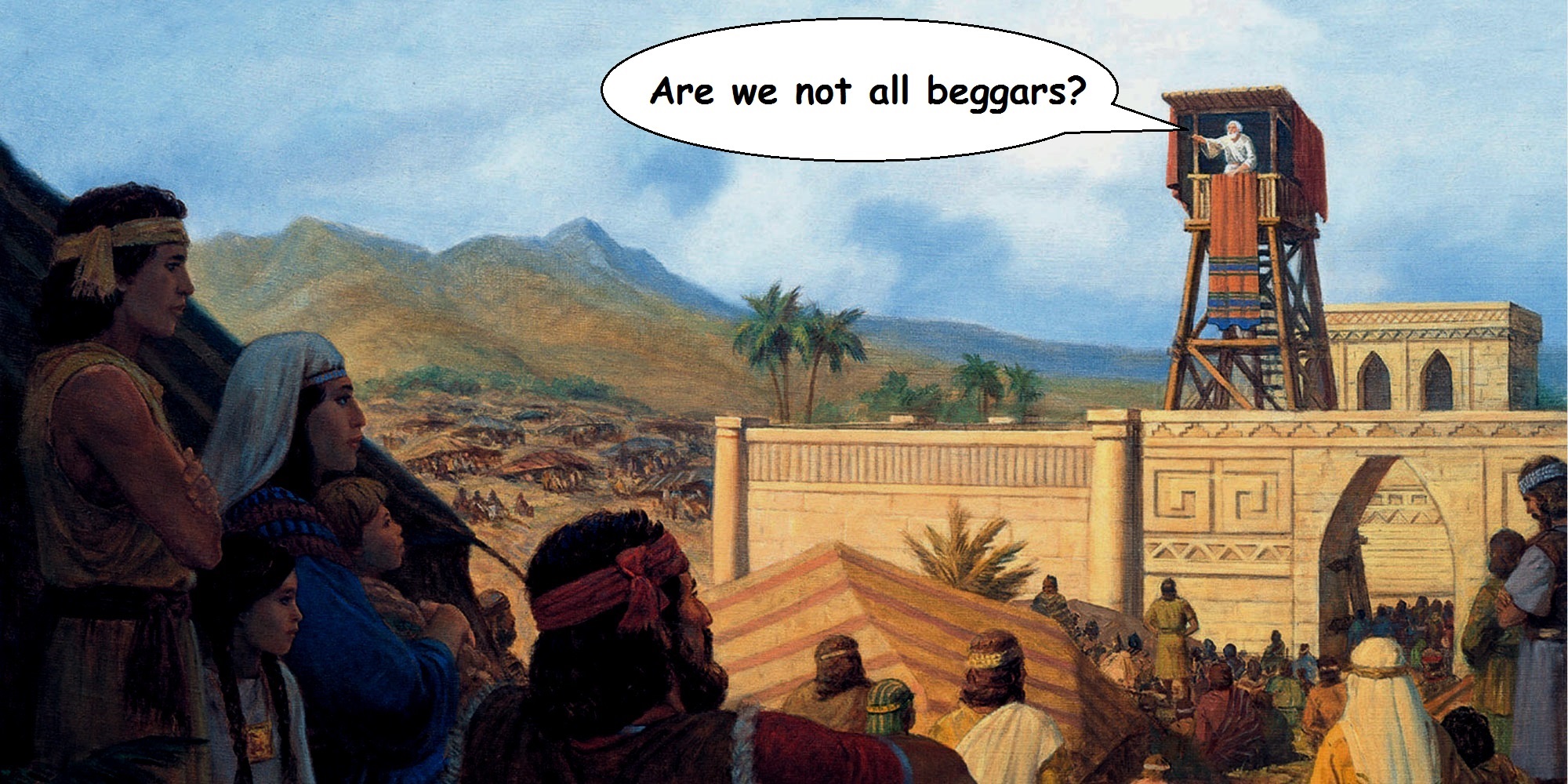“For behold, are we not all beggars? Do we not all depend upon the same Being, even God, for all the substance which we have, for both food and raiment, and for gold, and for silver, and for all the riches which we have of every kind?