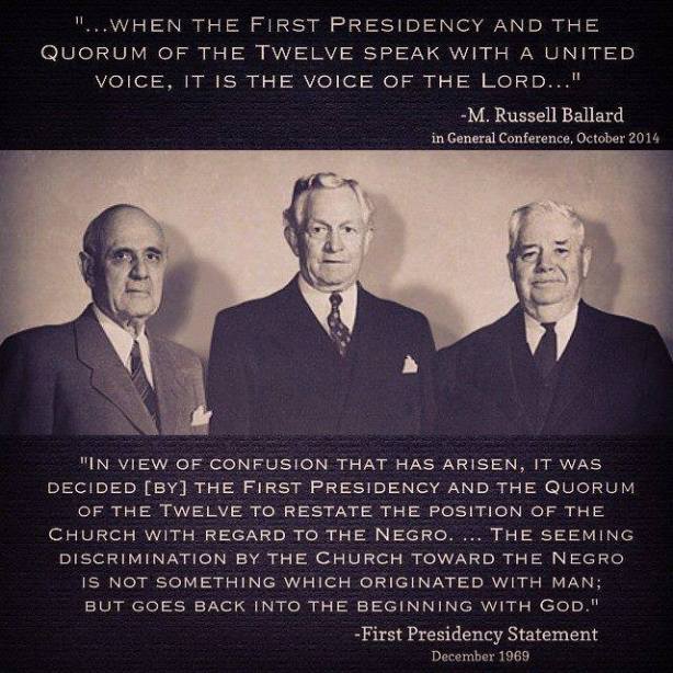In view of confusion that has arisen, it was decided at a meeting of the First Presidency and the Quorum of the Twelve to restate the position of the Church with regard to the Negro both in society and in the Church.