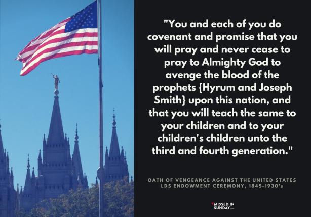 However, and bizarrely, despite this seditious oath being publicly exposed during the Reed Smoot hearing the LdS Church still continued to use the vow of vengeance in the Temple Endowment Ceremony until 1927 after which it was dropped.