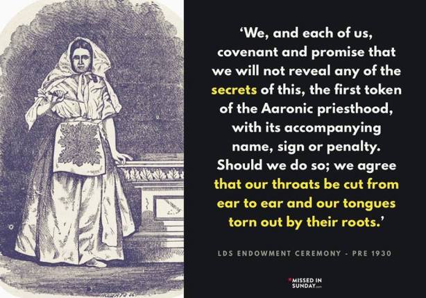 I went to Salt Lake City in 1856. They gave the endowments of washing and anointing, and then there was an oath taken in Utah to avenge the blood of the prophet… In taking the endowments at Salt Lake there was the oath required, and the oath that was required was to ‘avenge the death or blood of the prophet.’ We were made to swear to avenge the death of Joseph Smith the Martyr, together with that of his brother Hyrum, on this American nation, and that we should teach our children and children’s children to do so. ‘The penalty for this grip and oath was disembowelment,’ I would not have discussed the method of these endowments when I was a member of the Utah Church. The penalty for revealing or disclosing these secrets was disembowelment. The grips and tokens of the priesthood were what we were not to disclose… I kept the obligation while living in Salt Lake City.