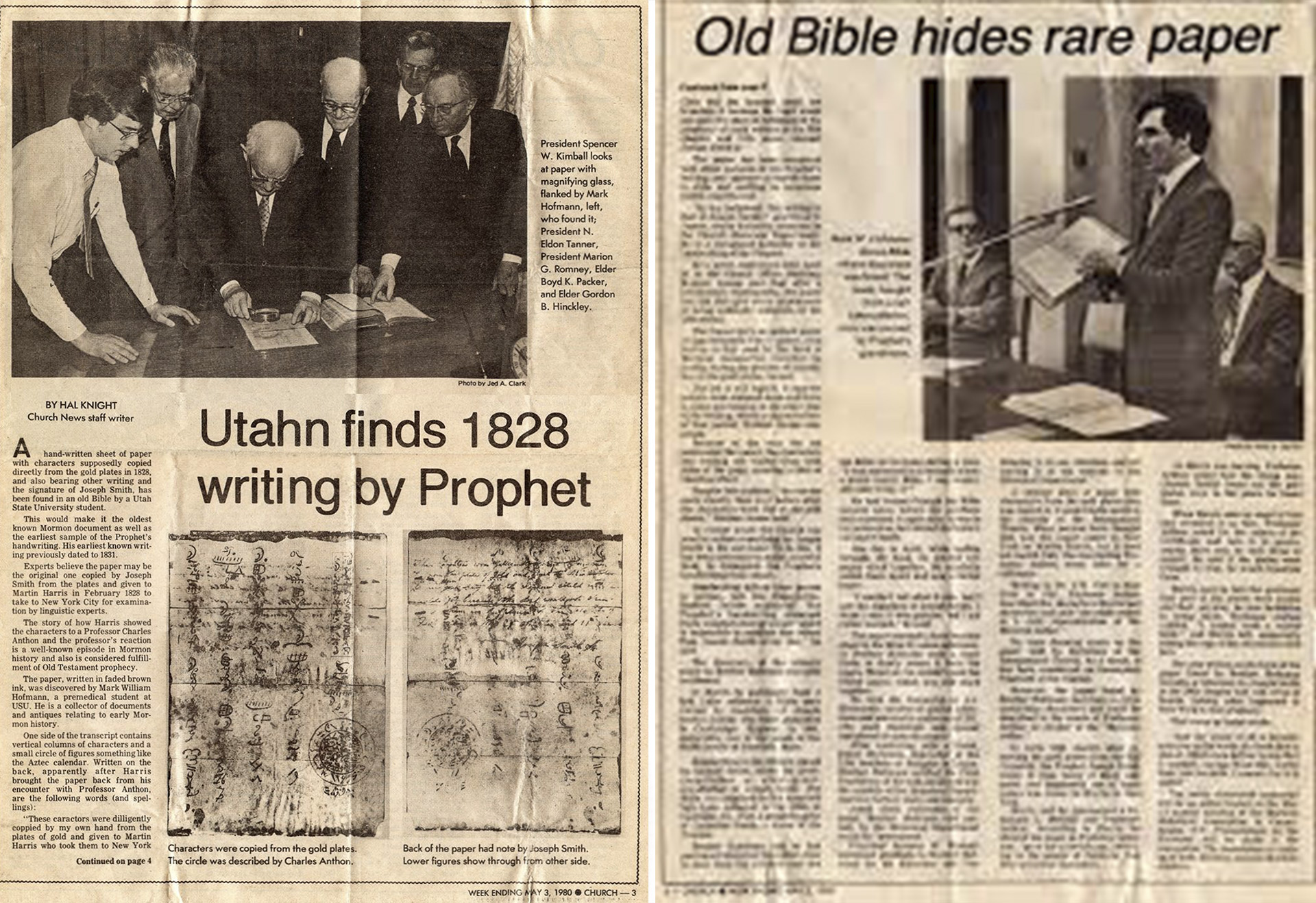The article regarding the Mark Hofmann “Anthon Transcript” find in the Week Ending May 3, 1980 edition of The Church New insert to the Deseret News, the Church-owned newspaper.
