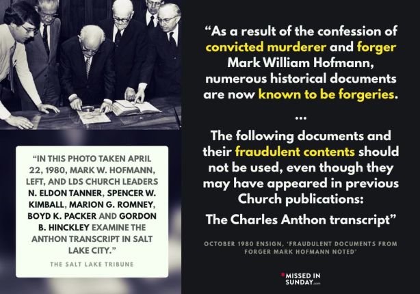 I mention this one because this is an apologetic argument that Mormons like to use regarding the Hofmann case which is another false premise when it’s examined against the evidence. Specifically, in addition to leading the Church astray in regard to the authenticity of the forgeries (see above, #1 in particular), the LdS Church leaders were also changing Church origin doctrine (see above) based on Hofmann’s deceit. This is an easily documented fact.