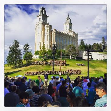 A Biblical Christian enjoying the moment with a Latter-day Saint outside the Manti Temple prior to the pageant. (photo credit: Mark Shreve)