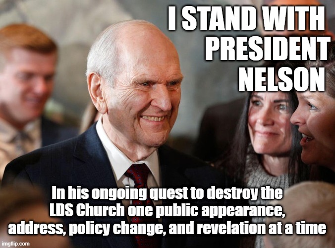 His predecessor, Thomas S. Monson may have been boring but at least he wasn’t actively destroying the LdS Church like his successor is. It’s to the point that it now seems like just about every time that he makes a public appearance, an address, a policy change, and/or a revelation, President Nelson adds another chink to the destruction of the LdS Church. So, the destruction that was once passive is now active thanks to the current LdS Church President. So, in no particular order other than to group events by incident, here’s what we’ve seen so far: