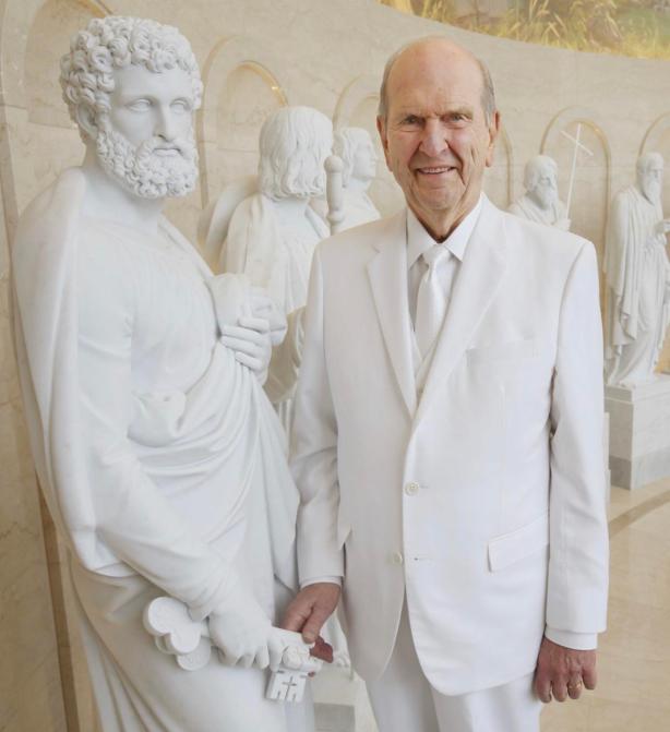 4) The Rome, Italy Temple Dedication Photo Op Fiasco 2019-03-10 As part of the Rome, Italy Temple dedication festivities, President Nelson participates in a photo op event in which he is photographed with a statue of Peter holding a key to the Kingdom of God. Mr. Nelson is gripping one side of the key thus causing the Internet to erupt simultaneously with laughs of derision that (their words) Nelson is trying to steal the key out of Peter’s hand and disgust that Nelson equates himself as Peter’s successor (thus setting himself as in competition and in opposition to the Roman Catholic Pope).