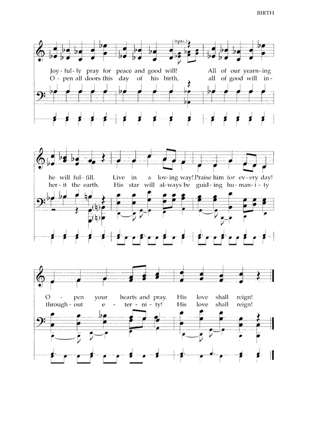 As time went on, she collaborated with Dave on several oratorios and cantatas, including La Fiesta de la Posada (Festival of the Inn) in 1975. Included within this Christmas Choral Pageant is “God’s Love Made Visible.” In a PBS interview, Dave said, “My wife was driving, and I said, ‘I’ve finished this (La Posada).’ And she said, ‘No, you haven’t finished it.’ And I said, ‘Well, what did I leave out?’ And she said, ‘God’s love made visible. He is invincible.’” Her lyrics resonate well with me, from the very title of the piece to the emphasized phrase, “His love shall reign.” Though it could be sung any day of the year, it is still a Christmas song for a Christmas pageant, as it declares, “Open all doors this day of his birth.”