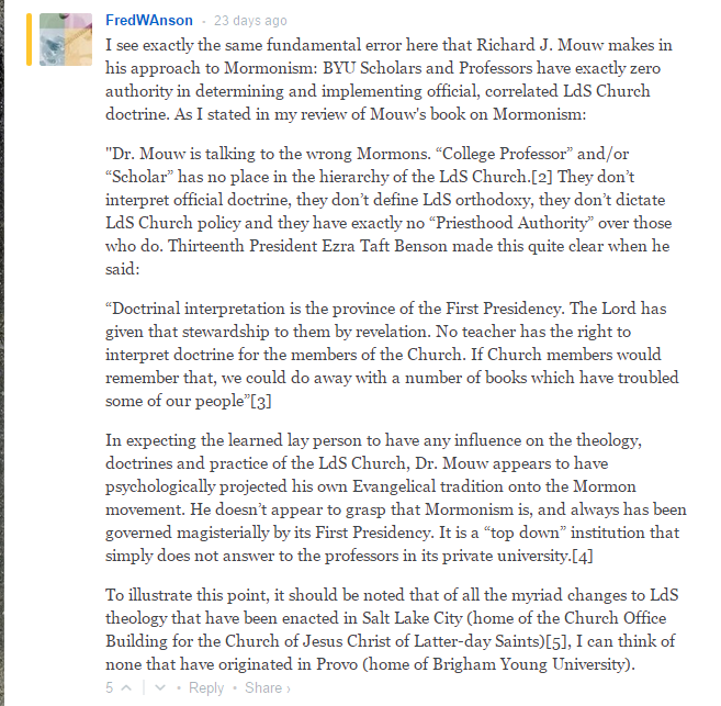 With all due respect, what Mouw’s Mormon friends told him carries no authority as far as defining what has official or canonical status in Mormonism. Gordon Hinckley’s statement to Time magazine also does not pass what Mouw himself says is the test, which is what Mormons say to each other—not what they say to the secular media.
